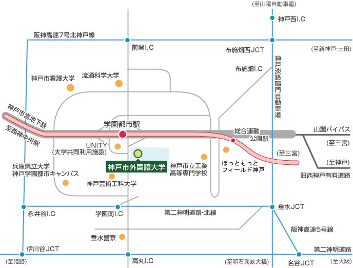 - 神戸市営地下鉄西神・山手線「新神戸」から「学園都市」まで約27分、「三宮」から「学園都市」まで約24分。