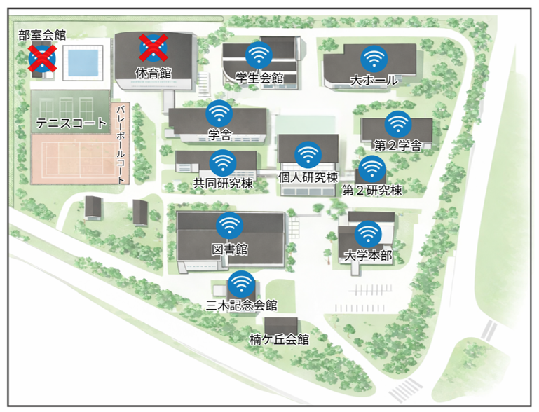 学内の対象エリアで利用できます。利用可能エリアは下記マップをご確認ください。